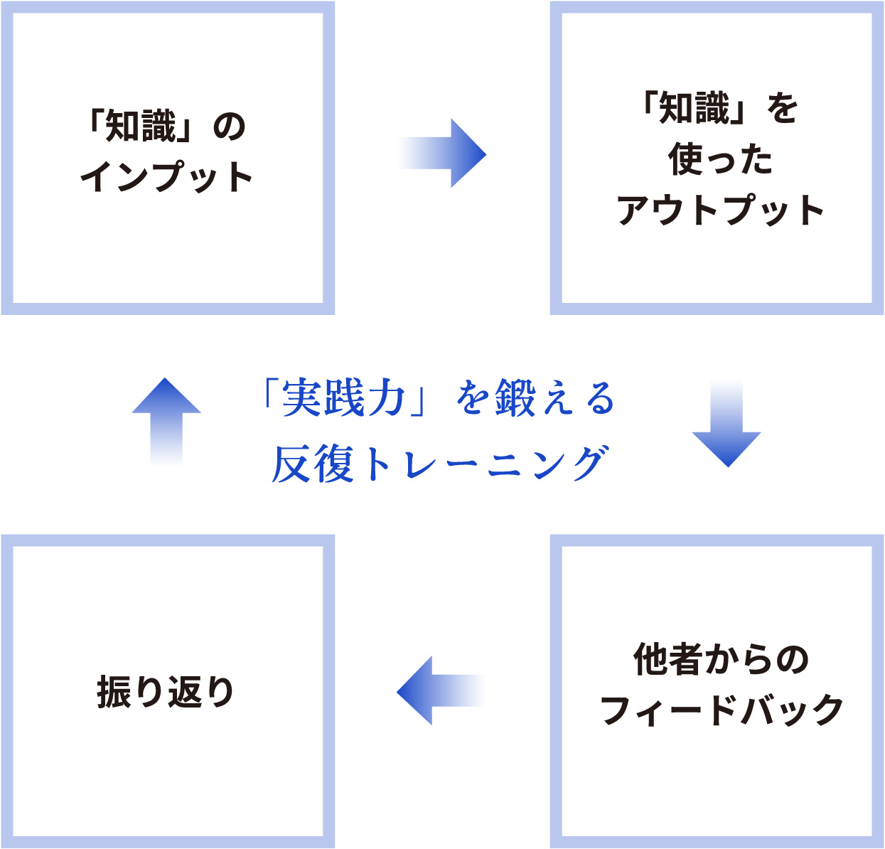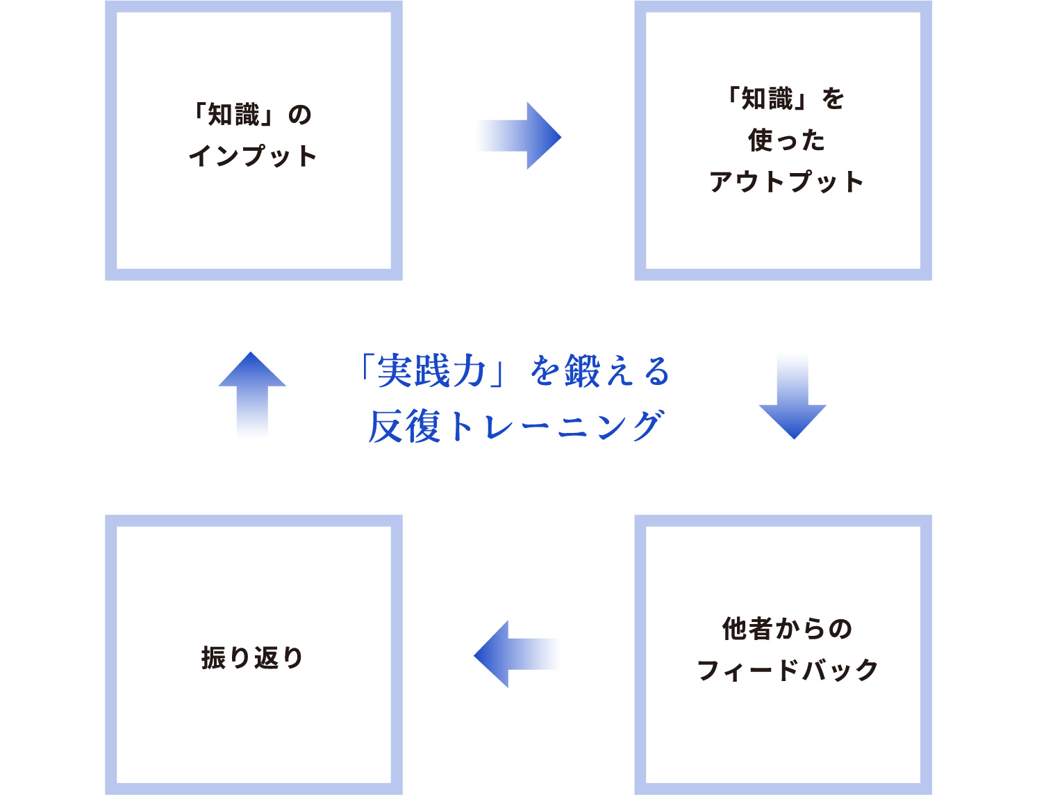 創造と変革を導くリーダーになるためには、困難な課題と向き合うためのマインドの醸成とスキルを具備することが必要です。グロービスでは「知識」のインプットに留まらず、知識をもとにしたアウトプットを重視し、そのアウトプットへのフィードバックを通じて、「実践力」を身に着けることを大切にしています。