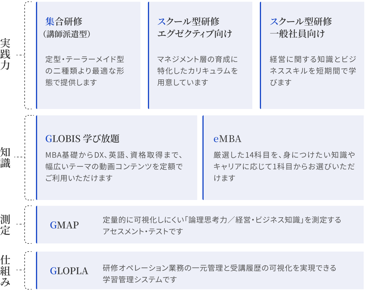 企業の経営課題に対し、人材育成・組織開発の側面から解決をお手伝いします。国内外の企業向けに、「集合研修(リアル/オンライン)」「英語研修(リアル/オンライン)」「動画学習サービス」「GMAP(アセスメント・テスト)」など幅広い手法で、ビジネスリーダー育成の多様なニーズに対応しています。